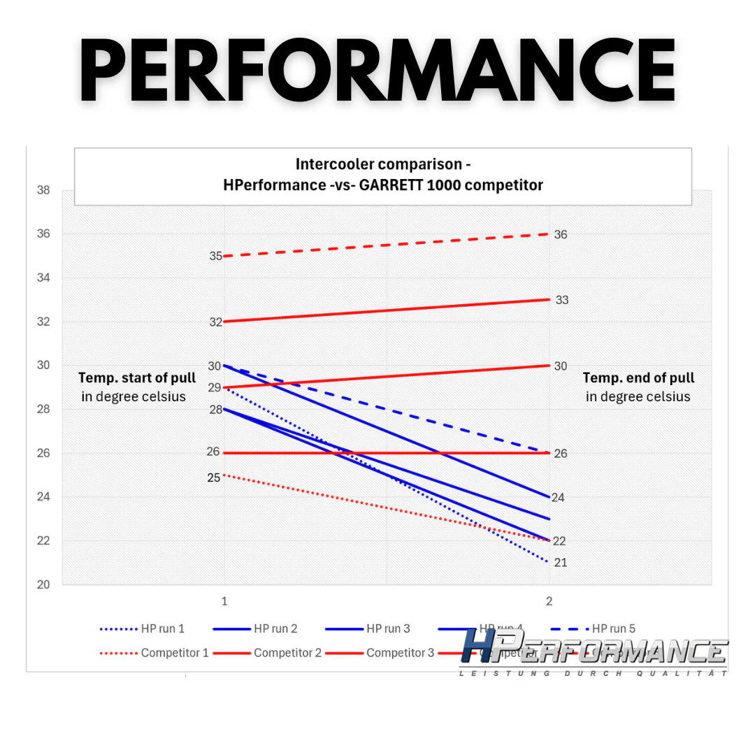 Um das enorme Potential des Kühlers besser einschätzen zu können, haben wir diesen im direkten Wettbewerbsvergleich mit einem GARRETT 1000 Ladeluftkühler verglichen.
