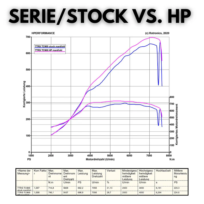 Selbst bei einem Level 3 mit TC870XT, oder TC900XT und ähnlichen Turboladern, die über 2 bar produzieren, ergibt sich bei 660 PS allein durch den Austausch des Ansaugstutzens bereits eine Steigerung von 30 PS.