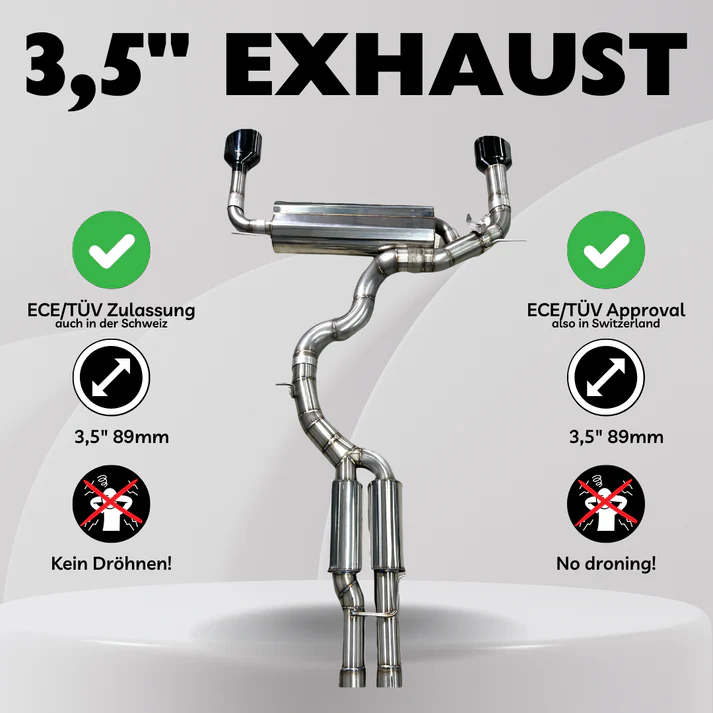 Die 3,5" 90mm Abgasanlage ist für Leistungen um die 900 PS ausgelegt und bietet außerdem einen tollen Sound, ohne dass es zu negativen Dröhneffekten im Auto kommt.